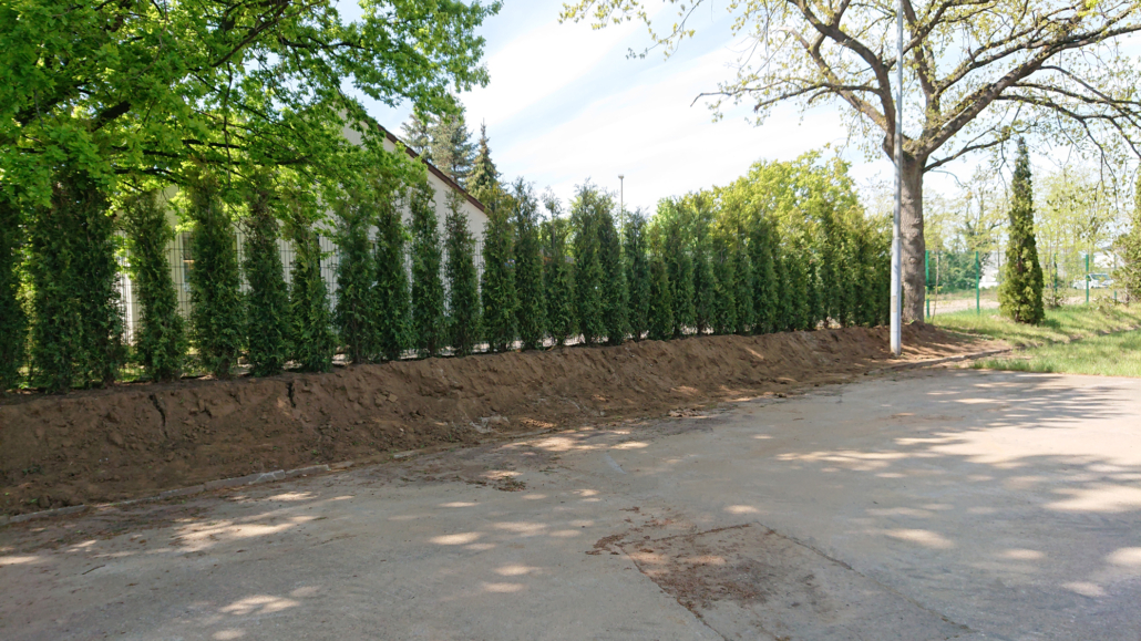 Arbeiten: Entwässerungsarbeiten und Planung, Pflasterarbeiten, Zaunbauarbeiten und Pflanzungen.
