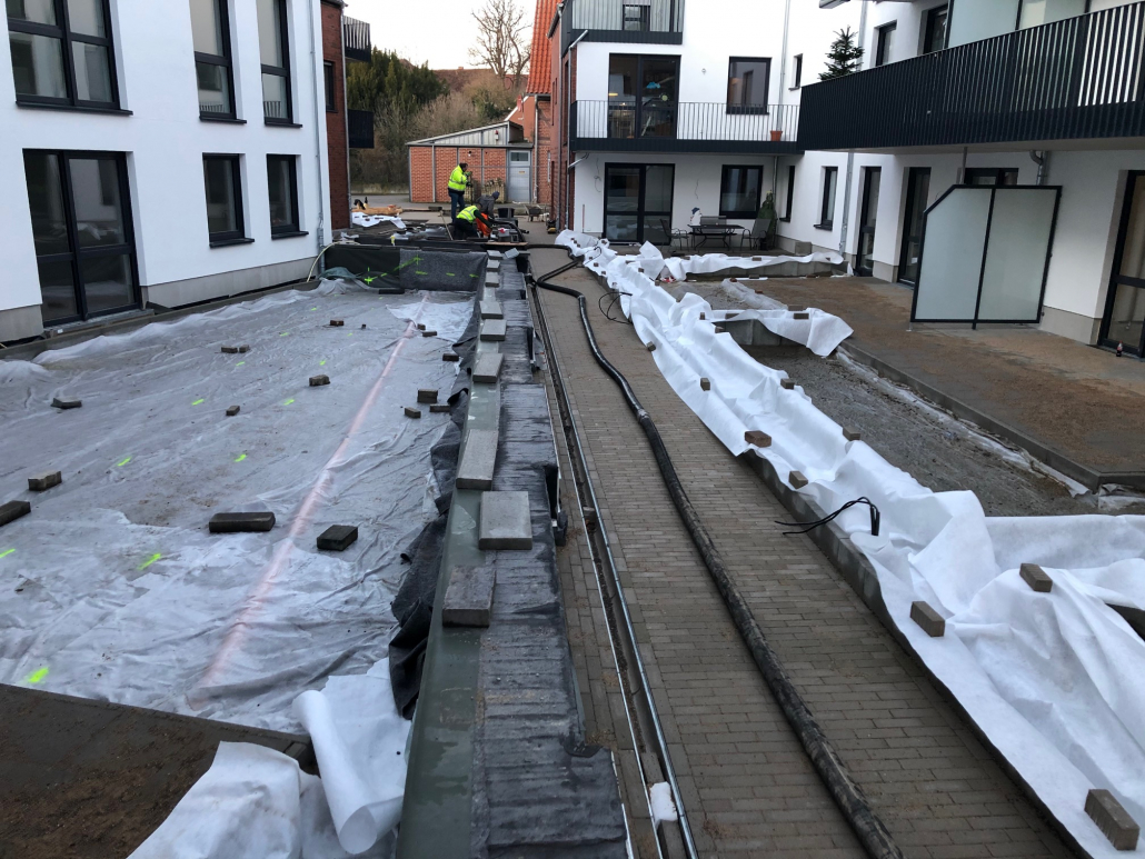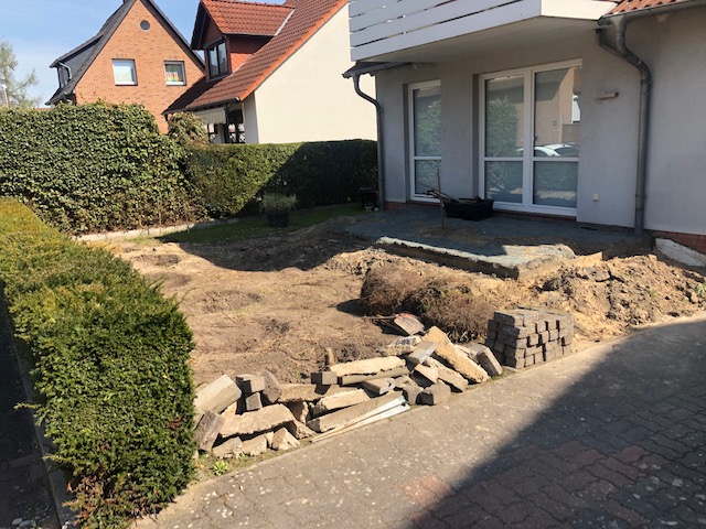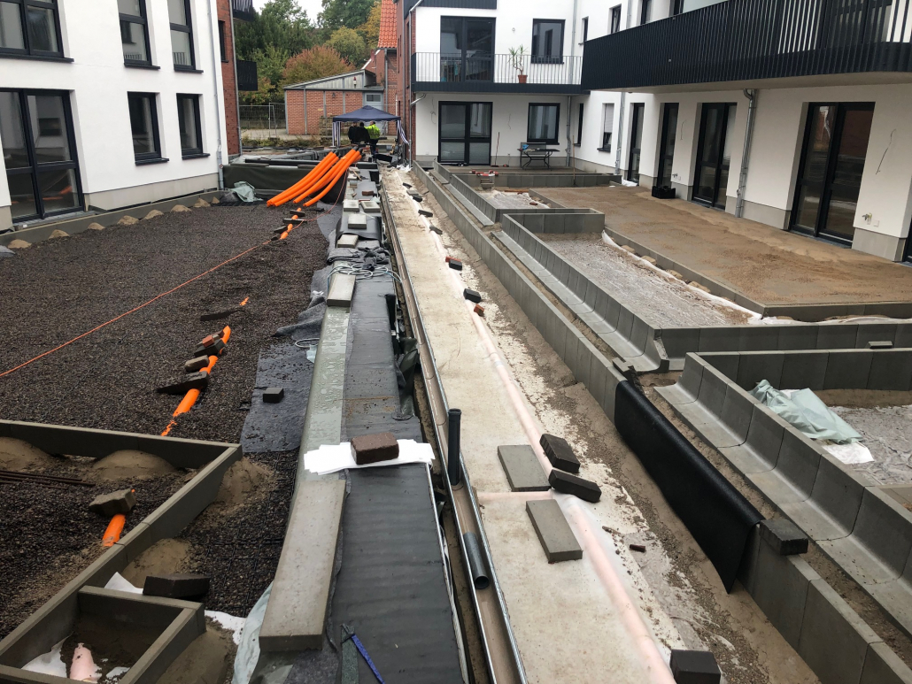 Arbeiten: Entwässerungsarbeiten, Pflasterarbeiten und Pflanzungen.