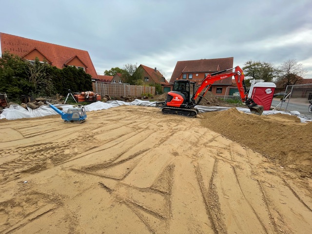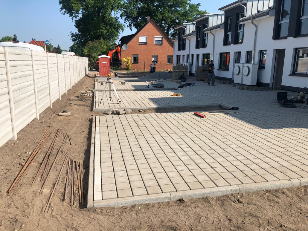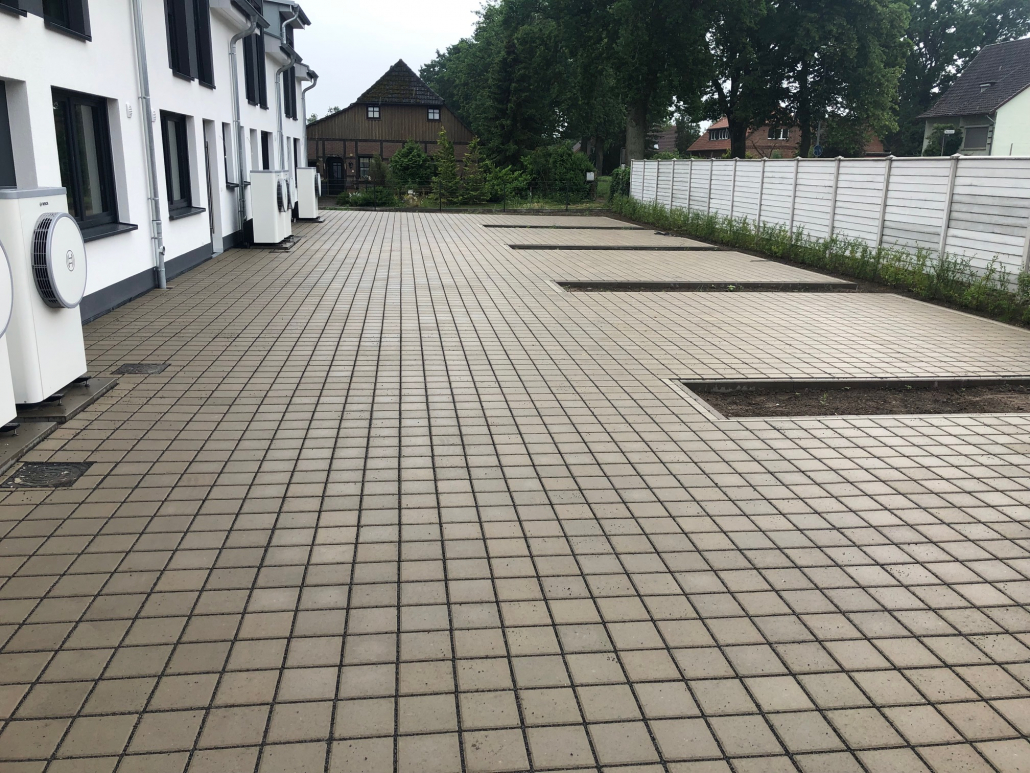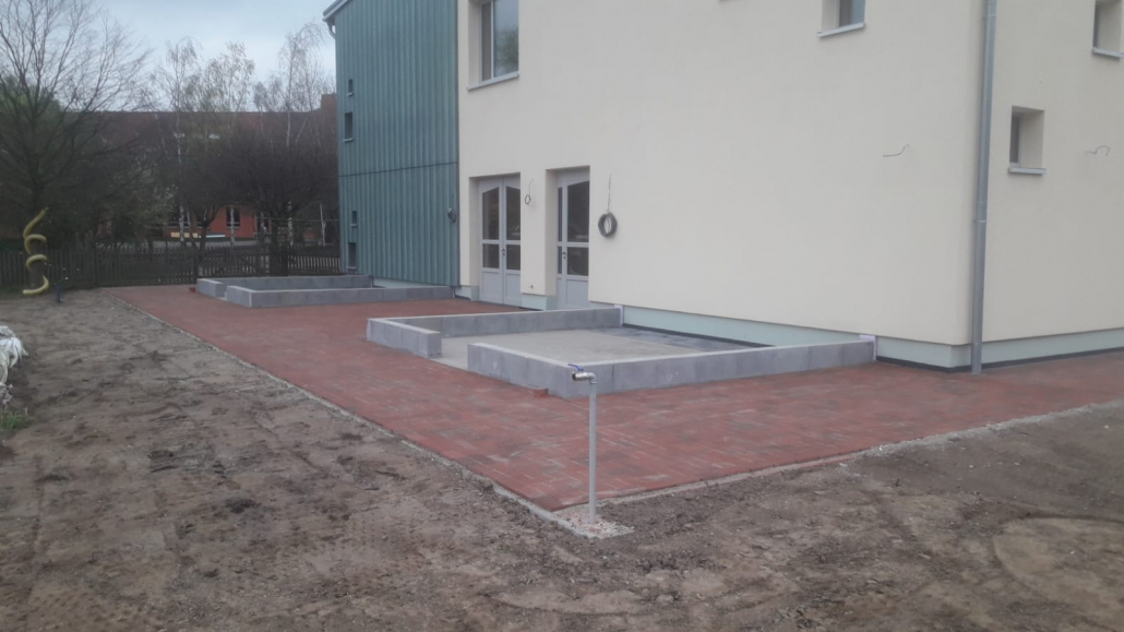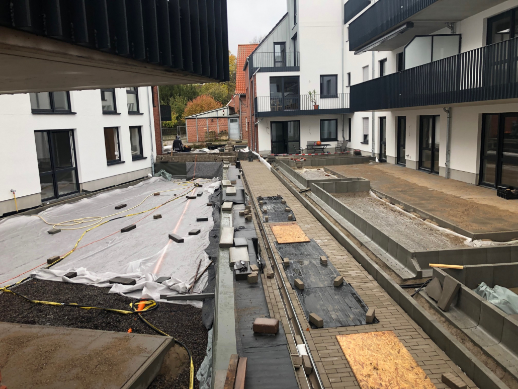 Arbeiten: Planungsleistung Außenanlagen und Entwässerung, Entwässerungsarbeiten, Pflaster- und Natursteinarbeiten.