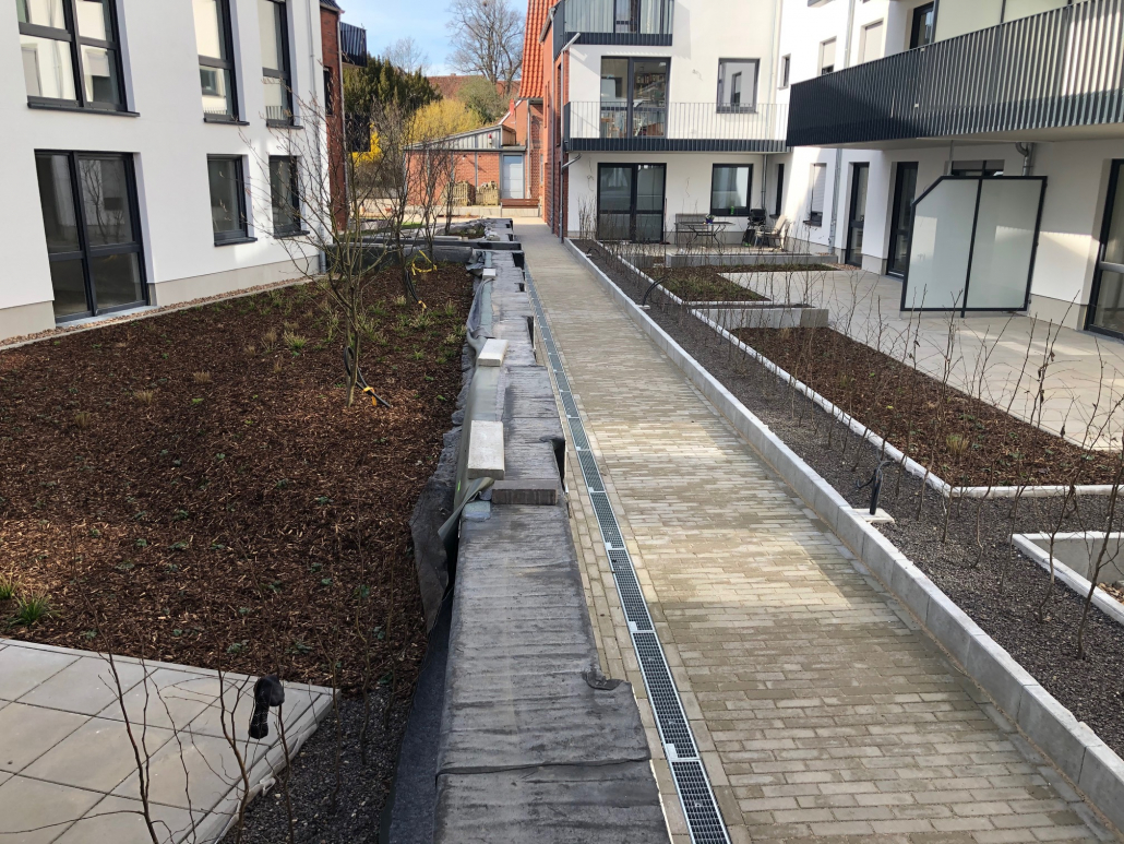 Arbeiten: Entwässerungsarbeiten, Pflasterarbeiten, Dachbegrünung, Ausstattung und Pflanzungen.